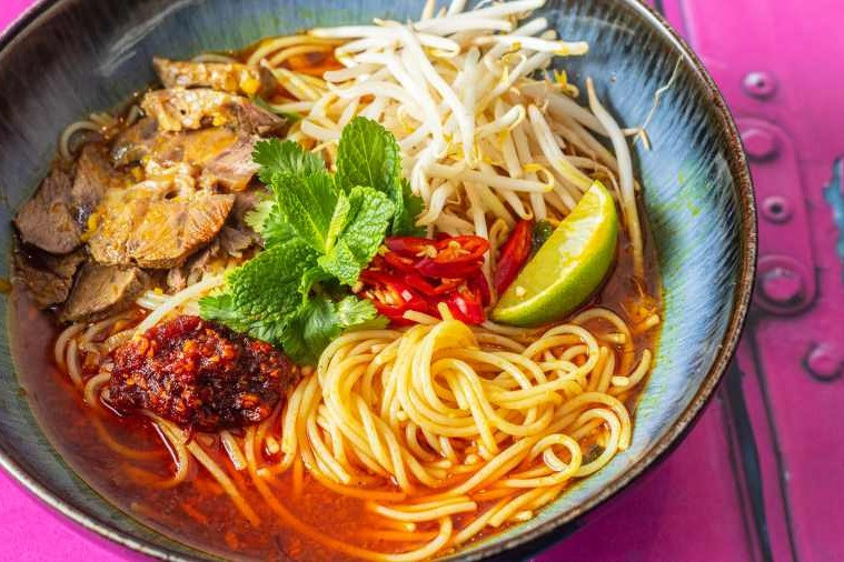 A richly spiced and aromatic Vietnamese beef noodle soup topped with fresh herbs and a deeply flavoured Sate sauce