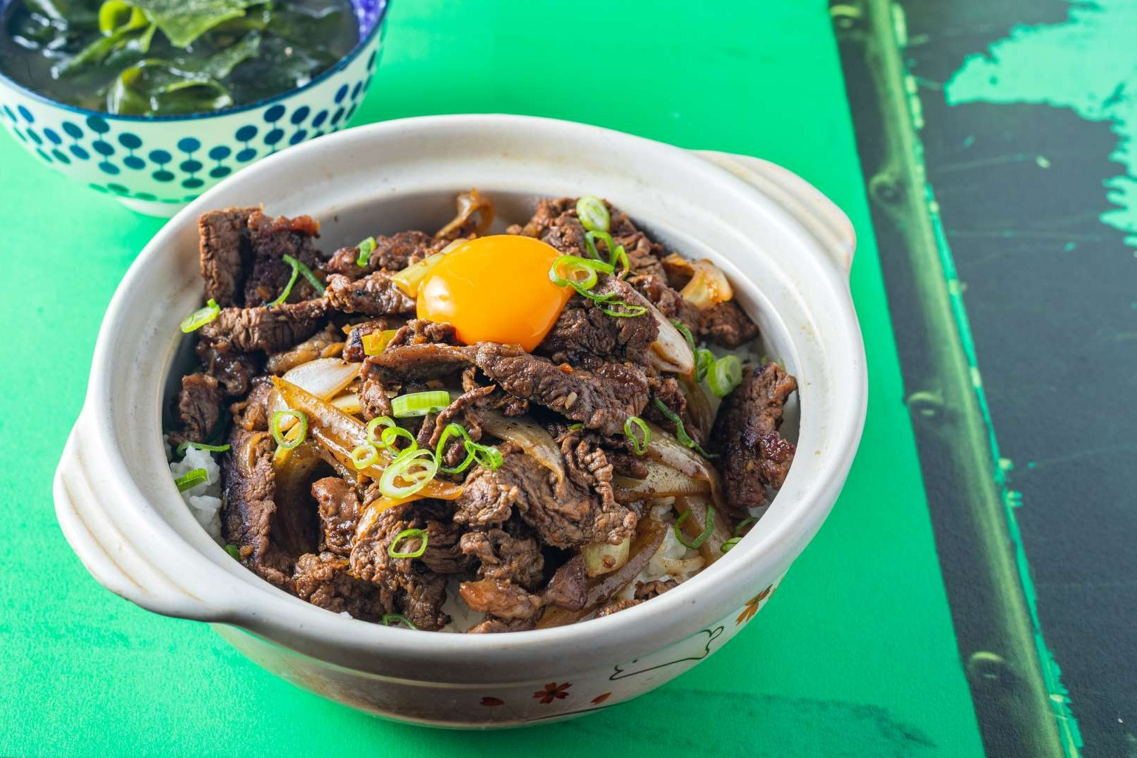 A warm bowl of simmered beef and onions in a sweet sauce over steamed Japanese rice, comfort food at its finest.