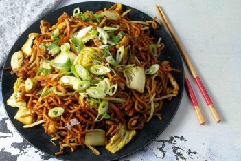 Crispy wok fried egg noodles with warming spices and chicken, perfect for a Friday night meal.