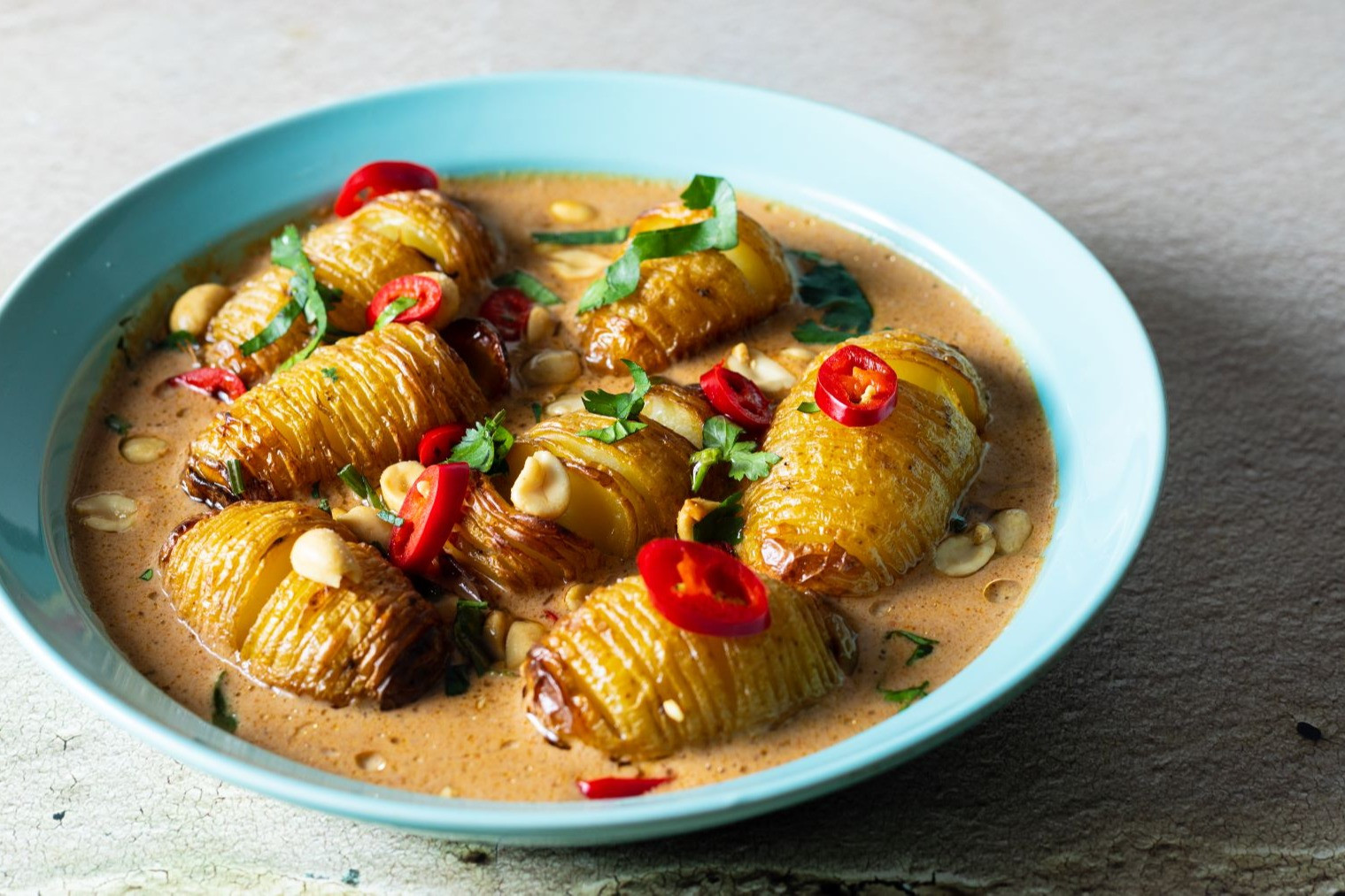 Marni's version of Massaman curry with crispy hassleback potatoes with a velvety spiced coconut curry sauce.