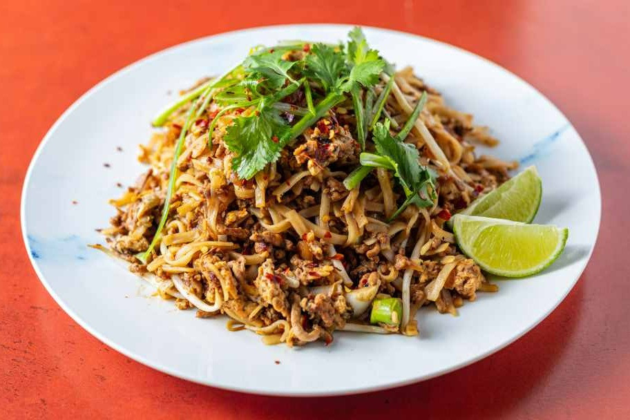 A Thai-style sweet, sour and salty pork and rice noodle stir fry