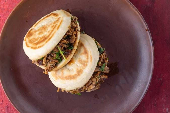 Rou jia mo, meaning 'meat sandwich'. With aromatic braised pork belly and handmade Chinese-style sandwich bread dipped in braising stock, this dish is pure comfort food.
