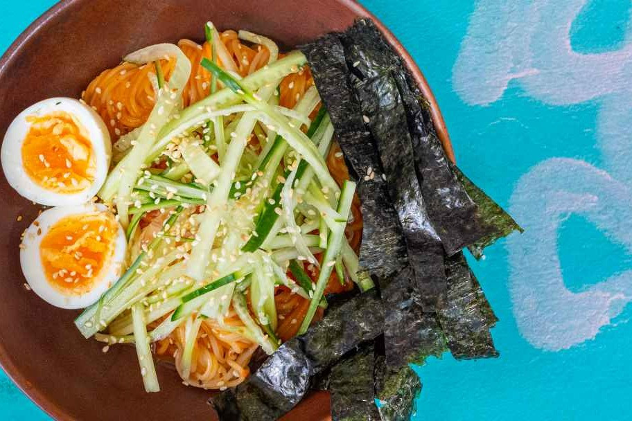 Embrace the heat and enjoy the refreshing cold noodles topped with a zesty sauce and fresh vegetables.