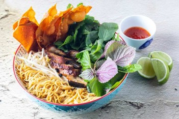 A Vietnamese-style noodle bowl with braised pork and fresh herbs