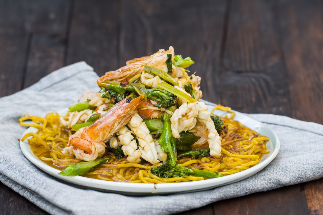 Deliciously crispy noodles, topped with fresh prawns and squid cooked in a tangy, spicy sauce.