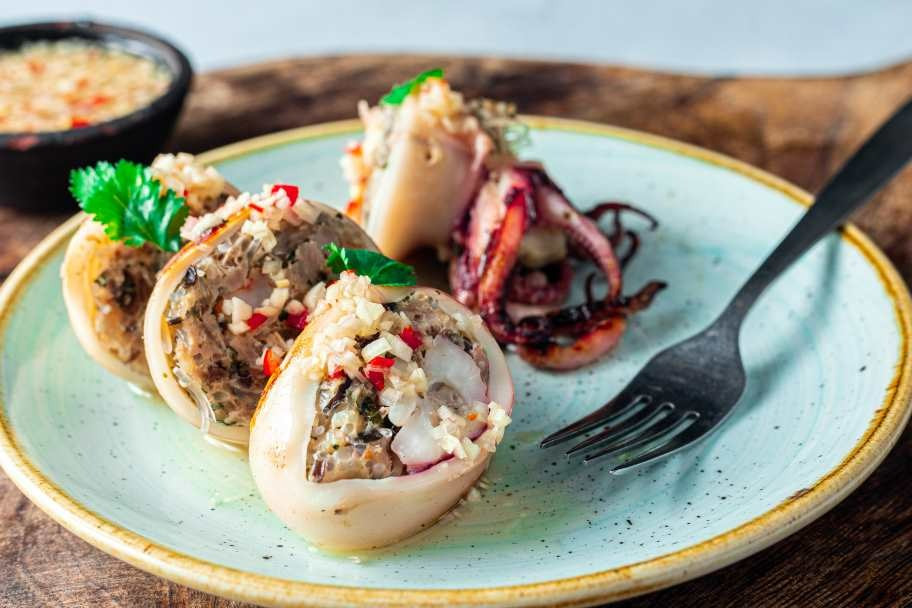 This grilled stuffed squid has a beautiful fragrant filling with tangy zest topping to pair with it.