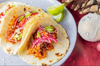 Juicy, soft and melt in the mouth Korean-style pork belly served with homemade corn tacos and quick pickled onions.