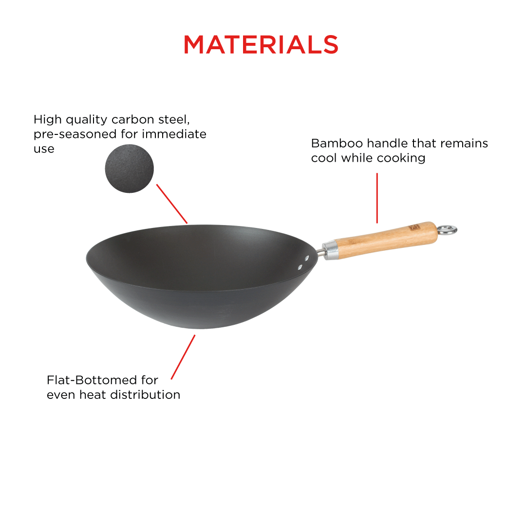 Carbon Steel Material: Made from 1.2mm thick (1.2 gauge) non-stick carbon steel, this wok is built to last and perfect for stir-frying.