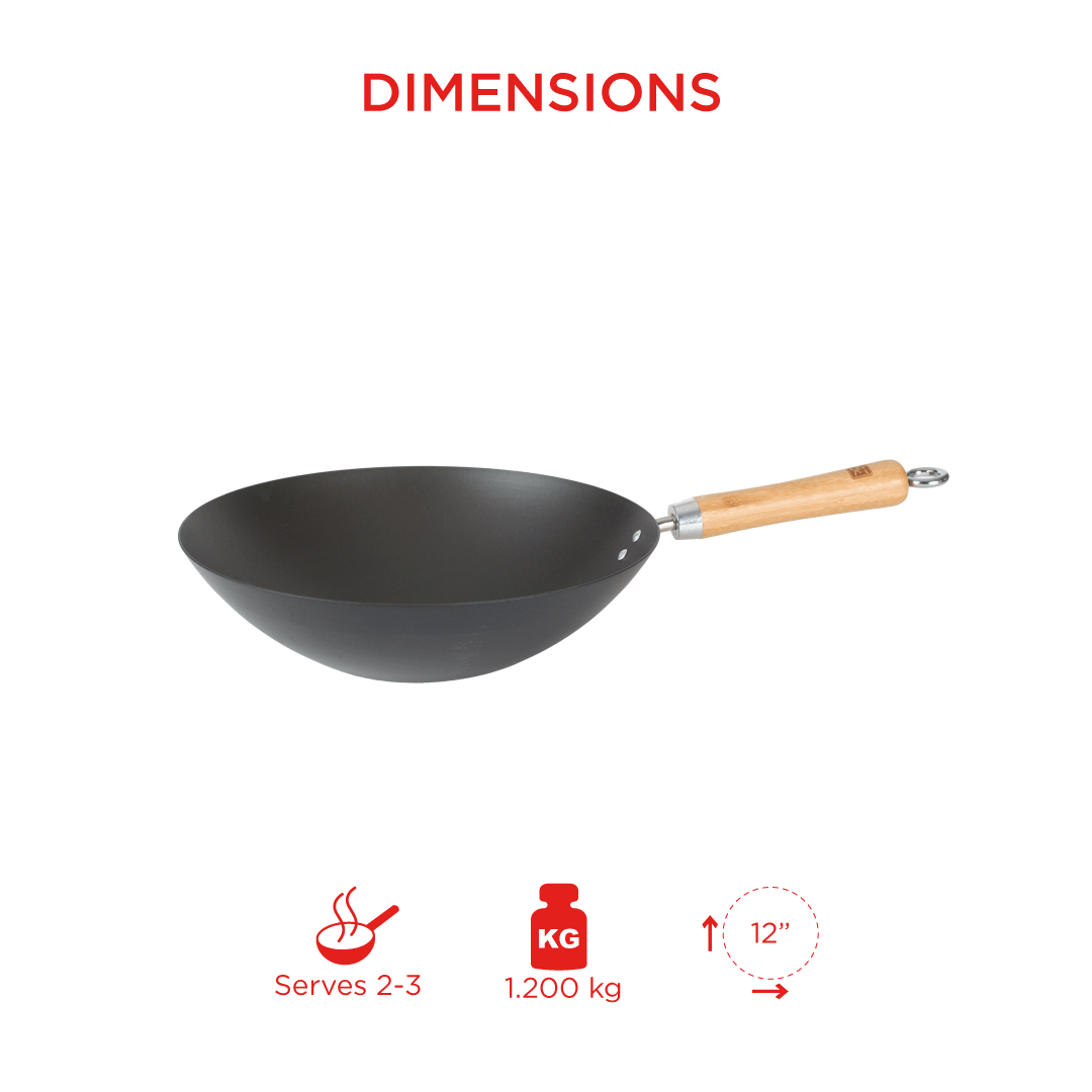 Get ready to cook up a storm with our 12" pre-seasoned carbon steel wok! This wok features a comfortable bamboo handle and a flat bottom, making it the perfect size for creating meals for 2-3 people. It's also suitable for all modern hobs, including induction.